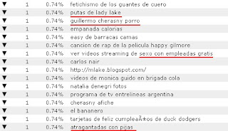 Parece que hay muchos interesados en ver a Cherasny fumando porro. Pero me mató el que llegó buscando "putas de Lady Lake" (?) y "atragantadas con pijas" (?). Más temprano hubo uno que llegó pensando que iba a encontrar la respuesta a "cómo vender una hamburguesa de lentejas" o "a qué llamas Circo Beat" (?). Y otro que buscaba "video pelado vela en la cabeza cancion" (imagino que se referían a "Turn It On, Tune In, Cope Out" de Freak Power). La gente cree que Google es el manantial eterno de perversión. Así no, así yo, no.